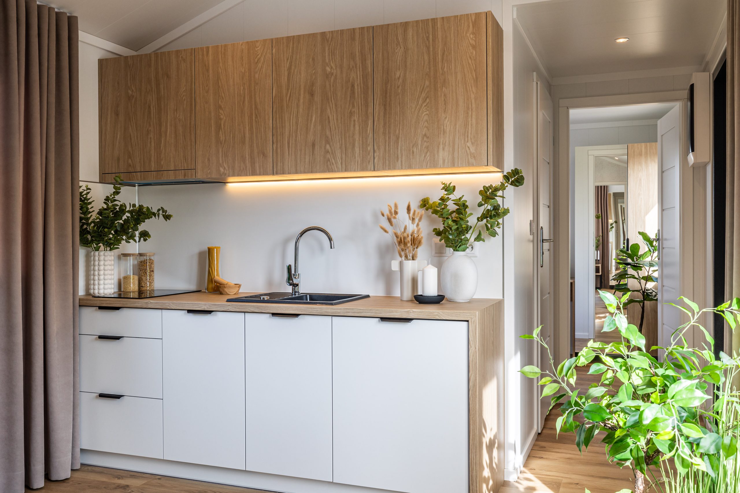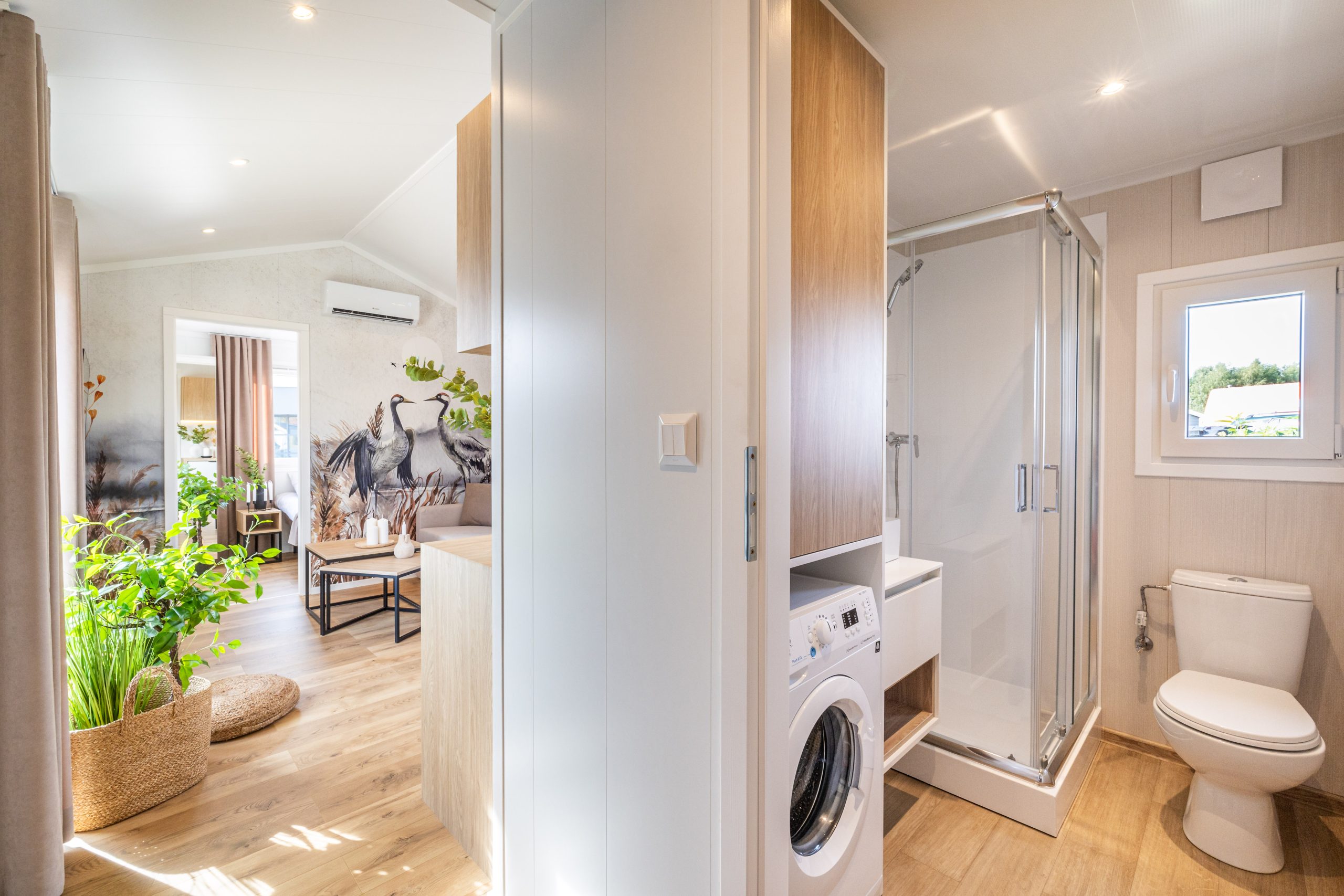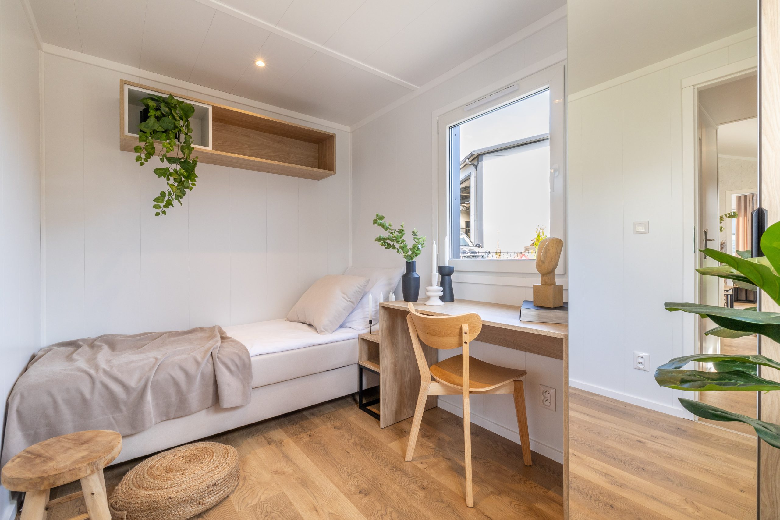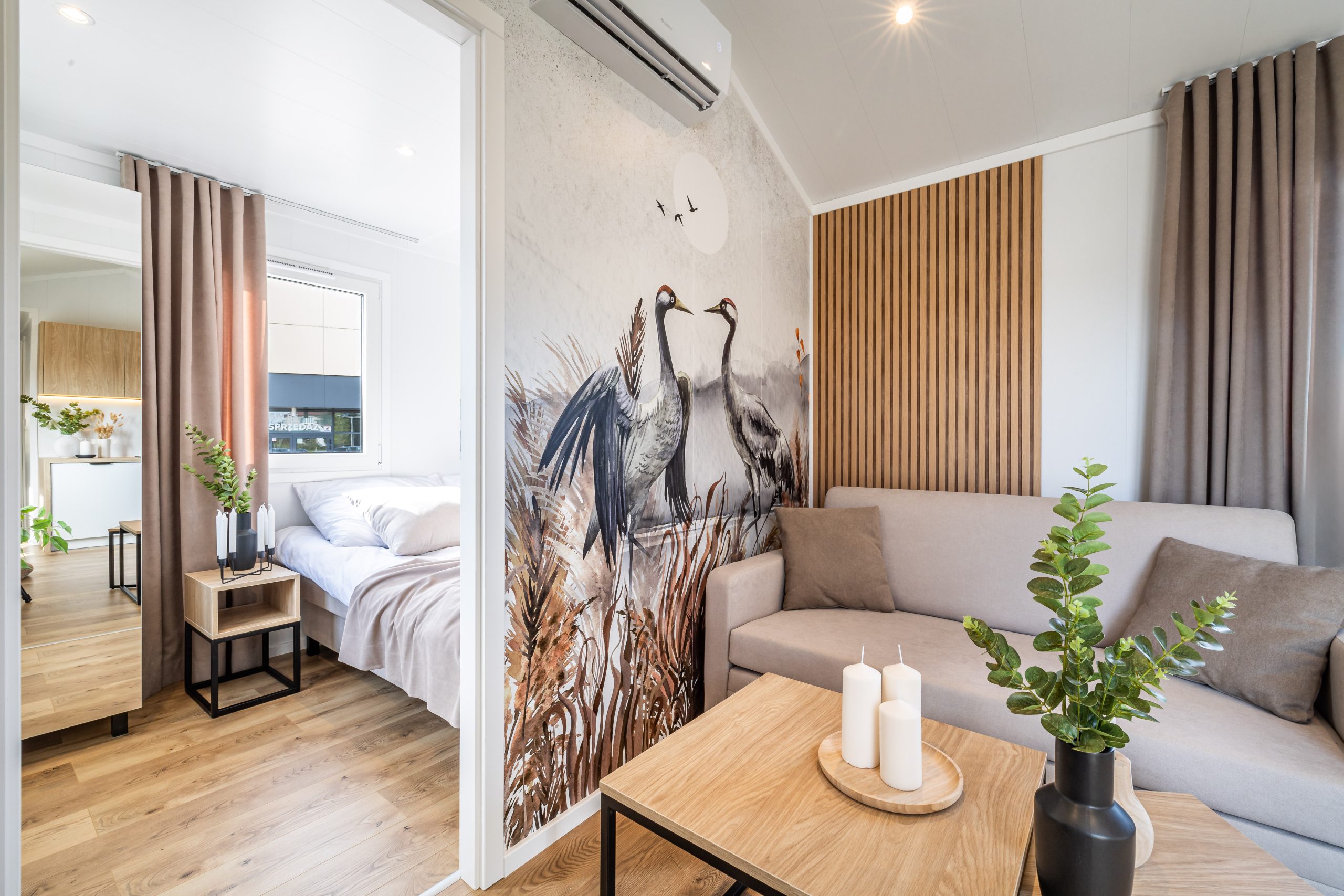 På et område på 10×3,5m finner du to soverom, et bad og en romslig stue med kjøkken. Takket være sovesofaen i stuen er det plass til overnatting av opptil 6 personer. Hjul, som er montert i konstruksjonen i hvert hus, gjør det mobilt og du kan plassere huset hvor som helst på tomten.